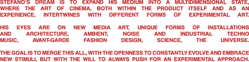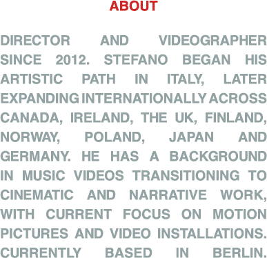 By the time I found it,I was entangled unceasingly. By the time I found it, I was entangled unceasingly. VIDEO WORK ZEISS MICROSCOPY X MAGNIFICENT MATTER / @ EXPO OSAKA 2025 CATATUMBO LAB / PROMO VIDEO 2025 LUMUS INSTRUMENTS / CONTRARIUM LOFI – MAARTEN VOS X MAX FRIMOUT 2025 SARA PERSICO X MICA OKI / @ BERLIN ATONAL 2025 ENCOUNTERS / DOCUMENTARY (WIP) 2024 LUMUS INSTRUMENTS, SIMONE SMELT, ENEQUIST / @ MONOPOL, BERLIN 2024 “VEKTOR” – CHRISTOPHER BAUDER X VOX / @ KRAFTWERK, BERLIN 2024 MY BODY IS_ / BERLIN ART WEEK @MAHALLA 2024 LOLO & SOSAKU / LIVE @ MAHALLA (WIP) 2024 ALIVE STUDIOS / PROMO VIDEO 2024 METAMORPHOSIS (IMMERSIVE INSTALLATION) [ORGANYSMO @MONOPOL, BERLIN] 2024 FUNCTION STORE – SANITY CHECK [ORGANYSMO LIVE @ MONOPOL, BERLIN] 2024 MANIFEST:IO 2024 LEDPULSE X MARIE ZECHIEL / @ MONOPOL, BERLIN 2023 RED WAVES // LEDPULSE X MONOPOL, BERLIN 2023 SHOWCASES SIMULACRUM (INSTALLATION) / @ BERLIN NEW MEDIA WEEK & BERLIN ART WEEK – MAHALLA 2025 ENCOUNTERS (CURATION) / “METASIS” IMMERSIVE SHOWCASE W/ AMIN SHAHSSAVAR LASER WORK @ 1_06 BERLIN 2024 THE SHORT NIGHTS OF BERLIN AT OPEN AIR KINO, BERLIN 2024 “MESH” / LOW TECH MIND CONTROL SHOWCASE @ QUANTUM GALERIE, BERLIN 2023 A QUIET SCENE – CURATED BY BRIAN ENO & ROGER ENO, LOS ANGELES 2020 “ASSENZIO” SHOWCASE / @ SAN MARCO HARD ROCK CAFÉ, VENICE 2016 ACCOLADES INVERTED AUDIO / “MOND” PREMIERE & REVIEW 2025 LENS ADDICTION / “METASIS” 2024 CINEMATOGRAPHY SALON / “CHANEL” 2021 BERLIN LIFT-OFF FILM FESTIVAL (OFFICIAL SELECTION) 2024 CORNWALL FILM FESTIVAL (OFFICIAL SELECTION) 2023 BUENOS AIRES INDIE SHOTS AWARDS (OFFICIAL SELECTION) 2021 NEVADA CITY FILM FESTIVAL (OFFICIAL SELECTION) 2021 FIGARI INTERNATIONAL INDEPENDENT FILM FESTIVAL (QUARTER-FINALIST) 2021 FESTIVAL DE CINE EUROPE DE PUERTO RICO (BEST CINEMATOGRAPHY AWARD) 2021 FAST NET FILM FESTIVAL (OFFICIAL SELECTION) 2021 PICTURE’S UP! FILM FESTIVAL (OFFICIAL SELECTION) 2021 ROMA CINEMA DOC (OFFICIAL SELECTION) 2021 MAINSTREET SHORT FILM FESTIVAL AT THE ESQUIRE (SEMI-FINALIST) 2021 FLORENCE FILM AWARDS (FINALIST) 2021 MONTREAL INDEPENDENT FILM FESTIVAL (OFFICIAL SELECTION) 2020 VENICE SHORTS (FINALIST) 2020 ALTRIMONDI FILM FESTIVAL (FINALIST) 2020 FLUVIONE FILM FESTIVAL (BEST DOCUMENTARY AWARD) 2017 VIDEOCONCORSO FRANCESCO PASINETTI (BEST MUSIC VIDEO AWARD) 2016 CONTACT email instagram vimeo imdb upscrolled